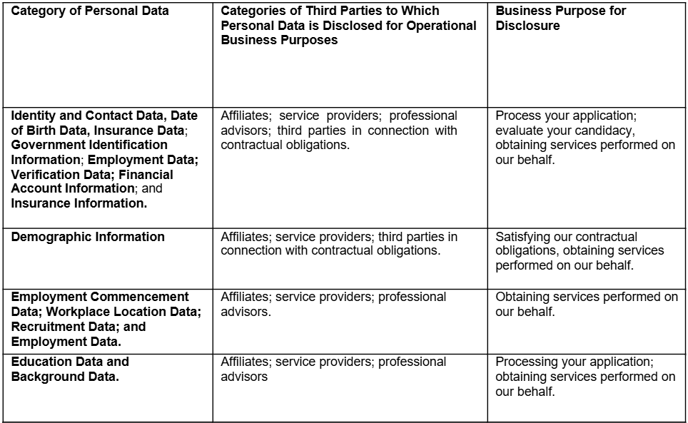 In the past 12 months, we have collected Personal Data discussed above in section 2 and Appendix 1. The chart below sets forth the categories of third parties to which we disclosed Personal Data for our business purposes within the preceding 12 months.