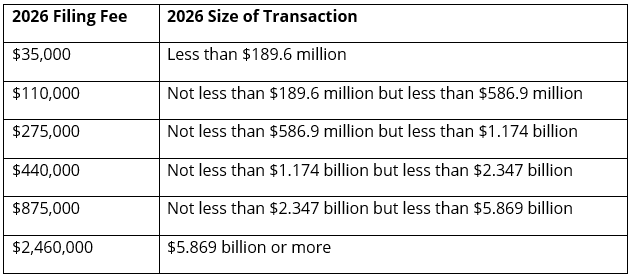 The HSR Act requires that certain transactions be notified prior to their consummation. This year, the “size-of-transaction” threshold for reporting mergers and acquisitions under the HSR Act will increase from $126.4 million to $133.9 million. In addition, the “size-of-person” threshold, the filing fee thresholds, and the fee schedule will all also increase. The new filing fee thresholds and fee schedule are as follows: