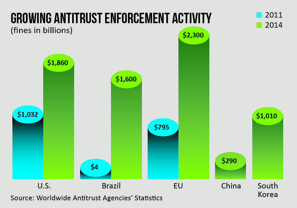 Meanwhile, a number of Asian countries are showing a growing interest in stricter antitrust enforcement, with some— such as Japan, South Korea, and Taiwan—allowing private antitrust actions. Over the past few years, China has been especially active. Under the country’s Anti-Monopoly Law (AML), regulators have fined a number of auto companies and suppliers along with contact lens, dairy, chipset, and LCD screen producers. In 2015, the fines were the largest yet under the AML, with one company fined almost $1 billion—and it appears that the focus on enforcement will continue. The AML allows private actions, and although those have been slow to develop, in time “China’s aggressive enforcement may lead to follow-on private litigation, opening the door to significant recovery opportunities,” says Murphy.